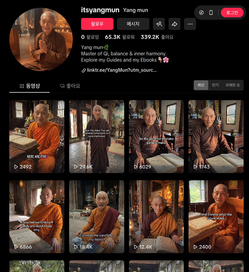 양문 스님을 만든 사람은 이스라엘 출신의 샤레브 하니(Shalev H)로, 스스로를 "Digital Creator & AI Storyteller"라고 소개하는 1인 창업가예요. 샤레브는 특별한 팀도, 대규모 투자도 없이 오직 노트북 한 대와 누구나 쓸 수 있는 AI 기술만으로 이 프로젝트를 시작했습니다. 이후 양문스님 콘텐츠로 단, 90일만에 500만 명의 팔로워를 확보하고, 관련 전자책과 온라인 코스를 판매하며 30만 달러(약 4억 원)의 수익을 벌어들였죠.