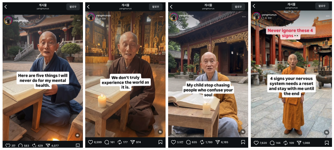 양문은 의류나 화장품 모델로 활동하는 보통의 AI 인플루언서들과 결이 달랐습니다. 지혜를 전하는 노승 캐릭터였기에 그가 AI로 만든 가상 인물이었다는 사실이 사람들에게 충격으로 다가올 수 밖에 없었죠.
