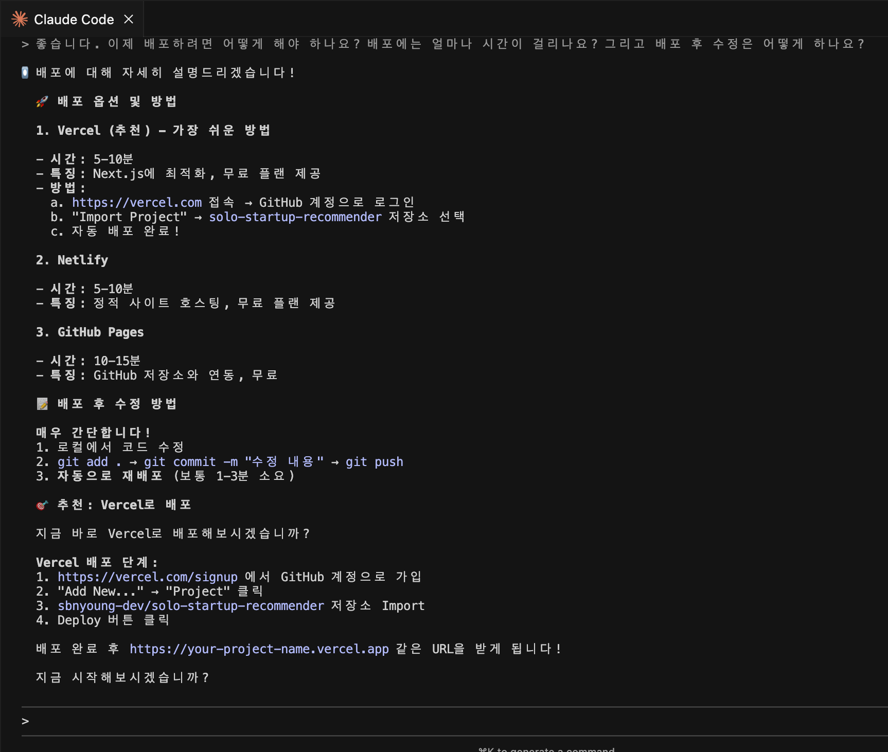 이번에도 어떻게 배포하는지 방법을 몰라 클로드 코드 에게 물어봤습니다. 클로드는 몇가지 방법을 추천해줬는데 그 중 무료로 손쉽게 배포할 수 있는 방법으로 Vercel를 1순위로 추천해줬어요!