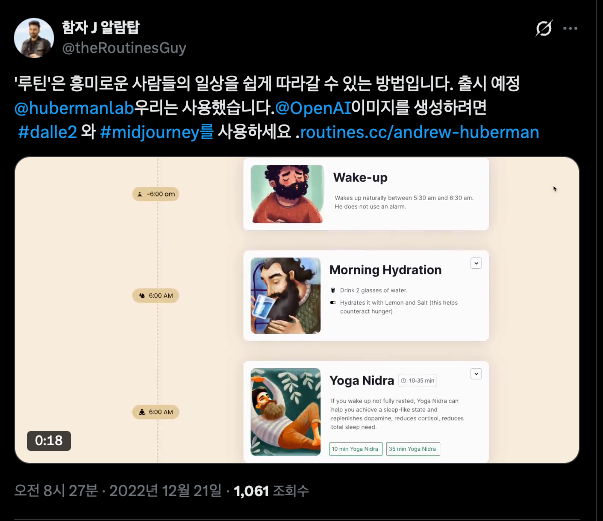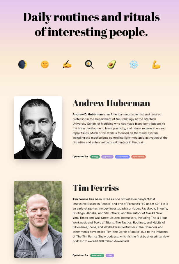 함자는 Webflow라는 노코드 툴을 사용해 Andrew Huberman의 루틴을 정리한 단 한 페이지를 만들었어요. Andrew Huberman의 팟캐스트와 인터뷰를 바탕으로 그의 하루 일과를 가독성 좋게 타임라인 형식으로 정리한 형태였죠. AI를 활용해 이미지까지 적절히 추가하니 누구나 이해하기 쉬운 페이지가 완성되었어요. 그는 이 테스트 단계에서 화려한 기능이나 수십 개의 콘텐츠를 준비하지 않았어요. 완벽함이 아니라 속도가 핵심이었습니다.