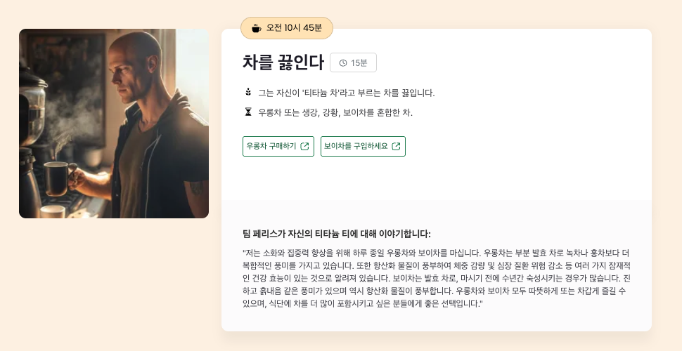 일반적인 글과 Routines.club의 차이는 명확했습니다. 예를 들어 "Andrew Huberman morning routine"을 검색했을 때, 일반 블로그는 긴 서론과 여러 문단을 거쳐야 정보를 찾을 수 있지만, Routines.club은 페이지를 열자마자 타임라인이 보입니다.