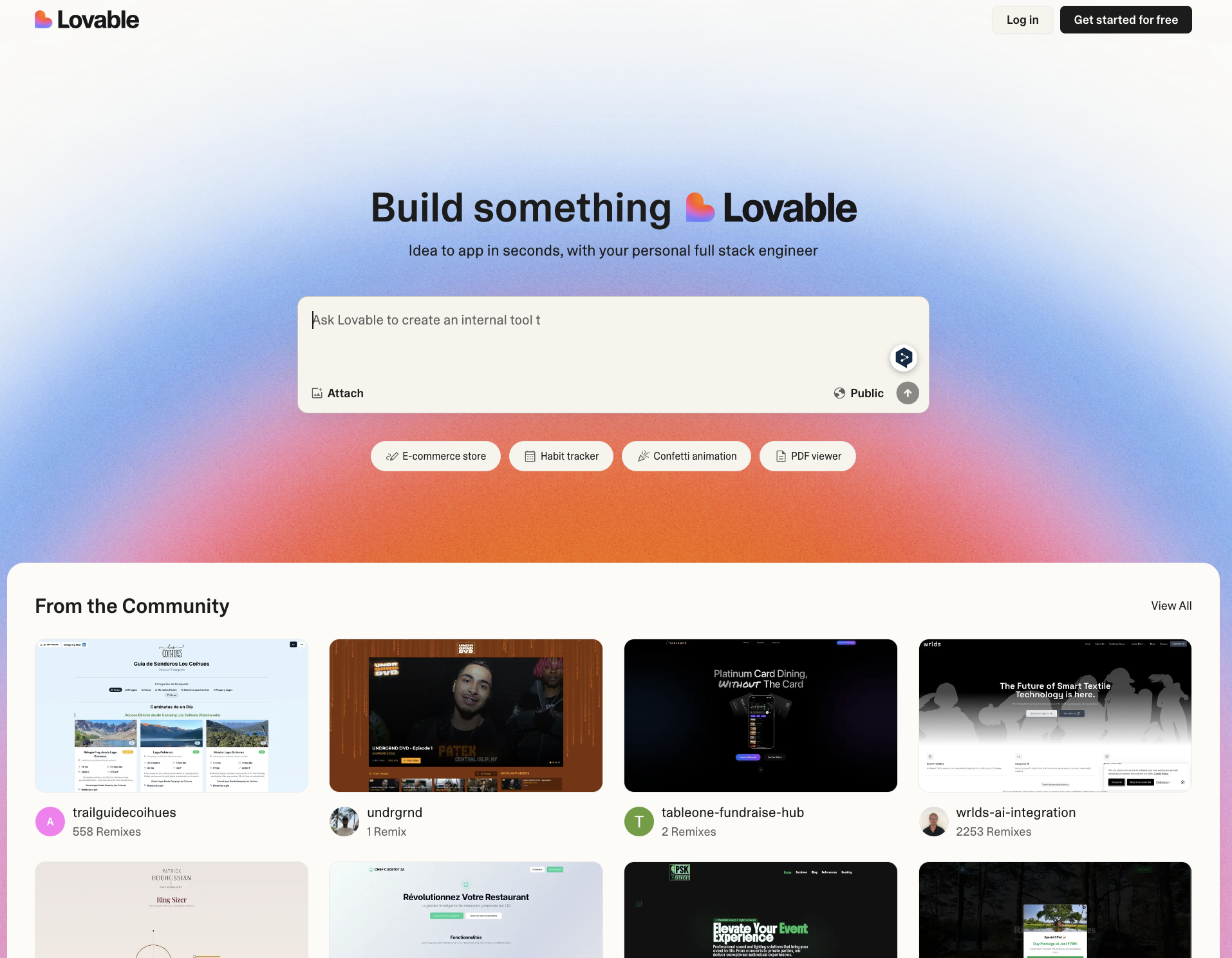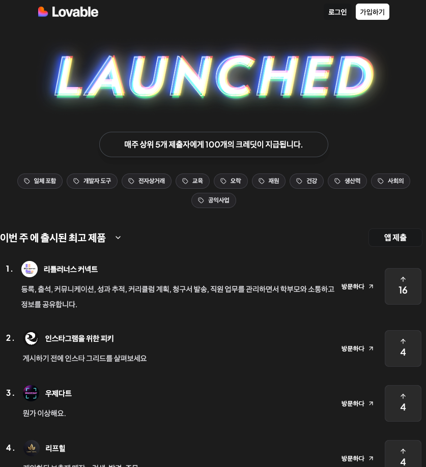 - Lovable Launched를 통해 Lovable로 만든 인기 프로젝트를 확인할 수 있다. 프로젝트 아이디어를 얻는 데에도 도움이 된다.