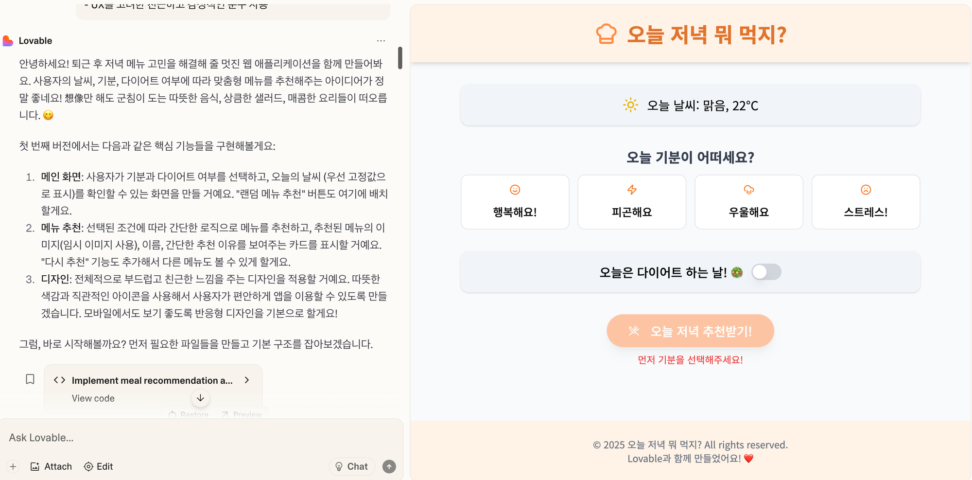 결과적으로는 Lovable로 빠르게 MVP의 초기 버전 정도는 확인할 수 있어 만족했습니다만, Lovable 무료 버전으로 비개발자인 제가 혼자 어디까지 구축 가능할지 궁금해졌습니다. 그래서 <퇴근밥 뭐먹지>를 좀 더 완성도 있게 수정 보완해 배포까지 진행해보려해요.