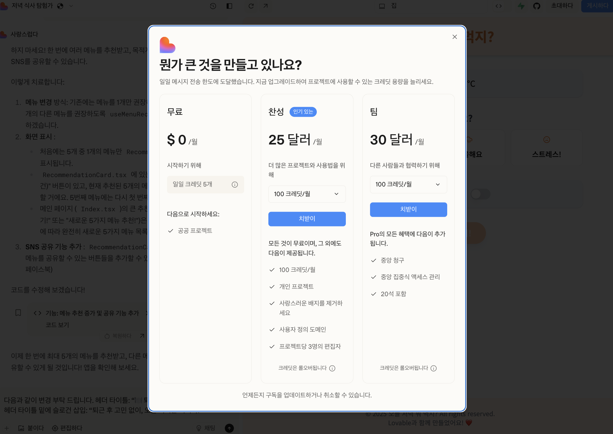 물론 당연히 디테일은 수정 보완이 필요했어요. 간단한 기능 수정, 헤더 문구 수정, 디자인 색상 수정 등을 Lovable 채팅창을 통해 한국어로 요청했는데 대부분 잘 반영되더라고요. 다만 정확도를 높이기 위해서는 기분에 따라 어떤 음식을 추천할 것인지 기초 데이터를 ChatGPT와 함께 만들어 입력하는 게 좋다는 생각이 들었습니다. 또한, 미세 조정을 위해서는 이쯤에서 Lovable 가이드 문서를 확인하는 것이 필요해 보였어요. 더 진행하려고 했지만, 갑자기 추가 이용은 결제가 필요하다는 화면이 떴습니다. 무료 버전은 하루 5개 크레딧 사용으로 제한되어 있거든요. 😭