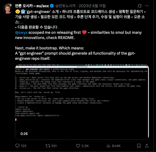 안톤은 자신의 생각을 증명하고자 2023년 6월, GPT Engineer라는 오픈소스 프로젝트를 시작했습니다. 당시 GPT Engineer를 소개하는 글과 영상을 트윗했는데, 이것이 큰 인기를 끌었어요. GPT Engineer는 GitHub에서 5만 개 이상의 스타를 획득하며 그 필요성과 사용성을 증명해냈습니다.