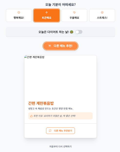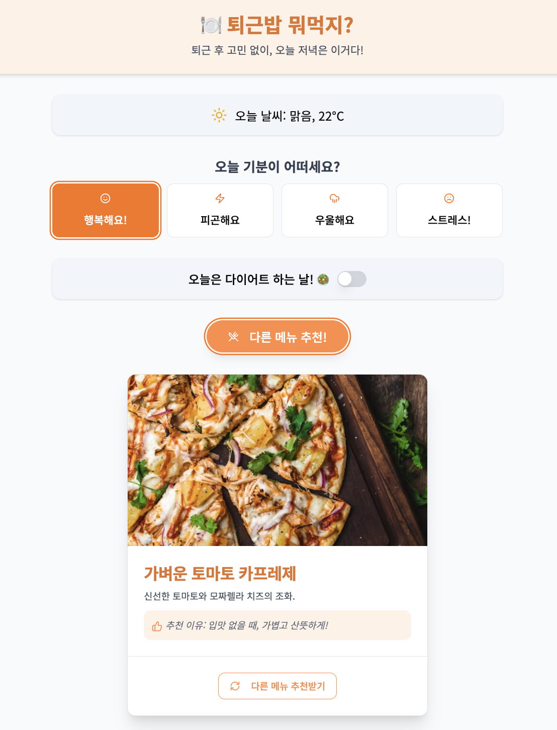 AI가 도와주겠지만, 개발 난이도를 최대한 낮추기 위해 단순하고 직관적인 프로젝트를 만들고 싶었습니다. 그래서 생각한 아이디어가 퇴근밥 추천 도구였어요! 직장인인 저는 늘 퇴근길에 저녁 메뉴를 고민하는데요, 맛있는 저녁을 먹으면 하루 동안 쌓인 스트레스가 해소되는 기분이 들거든요. 😆 그래서 그냥 저녁 메뉴 추천이 아닌, 퇴근길에 내 기분과 날씨, 그리고 다이어트 여부를 고려해 퇴근밥을 추천해 주는 도구를 만들어 보기로 했어요.