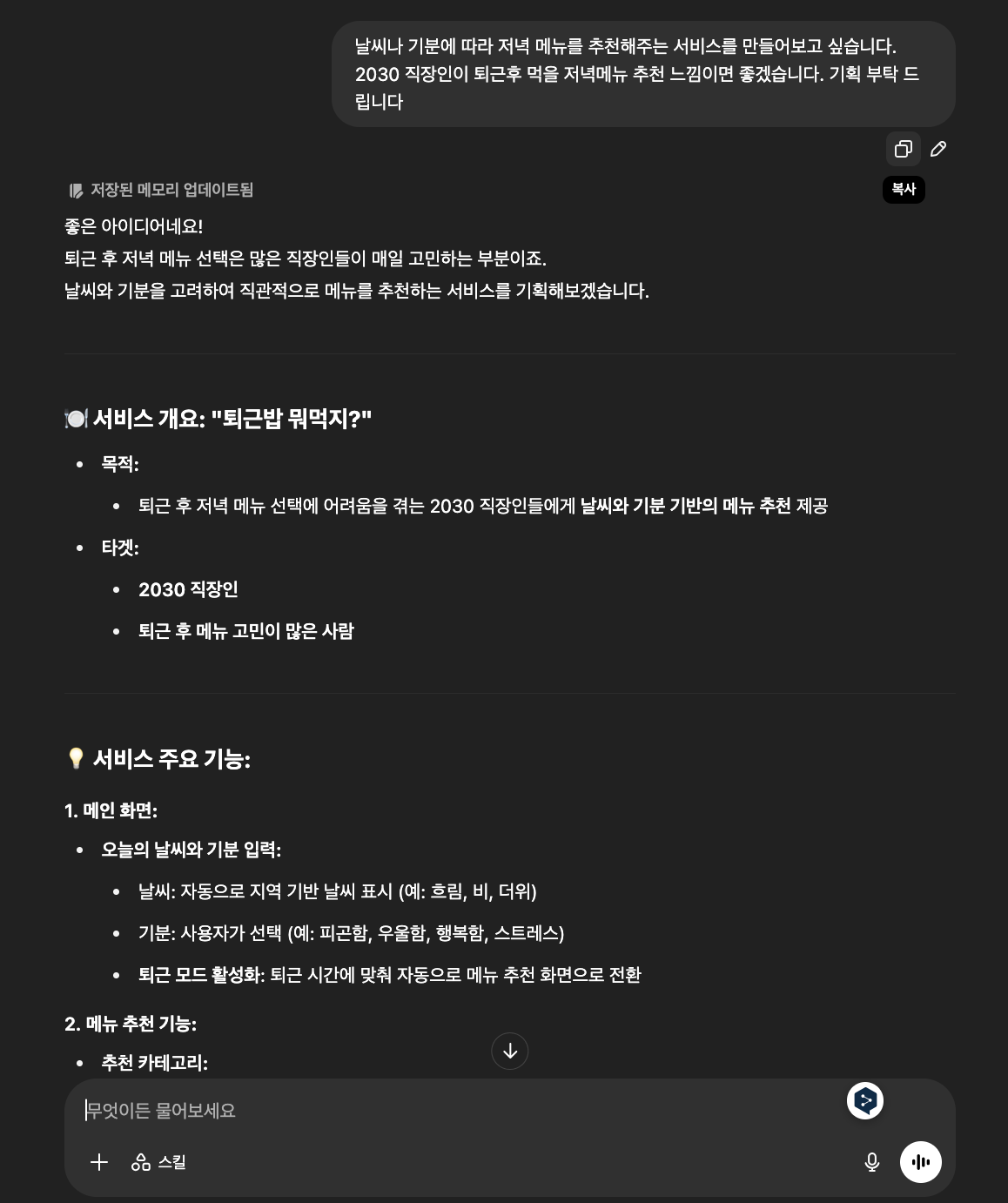 아이디어를 ChatGPT에 입력하고 서비스 기획을 해달라고 했어요. ChatGPT는 곧장 서비스 네이밍 (“퇴근밥 뭐 먹지?”)부터 각 화면별 주요 기능, 부가적으로 있으면 좋을 기능, 수익 모델과 개발 고려 사항까지 쭉 정리해줬습니다. 특히 메뉴 추천 시 사용자 근처 식당을 탐색하는 기능을 추가할 것을 제안해줬는데, 이 기능이 포함되면 정말 좋겠다고 생각했으나... 서비스를 최대한 단순하게 만들고 싶어 포기하고 나머지 기능 중심으로 GPT와 기획안을 발전시켰어요.