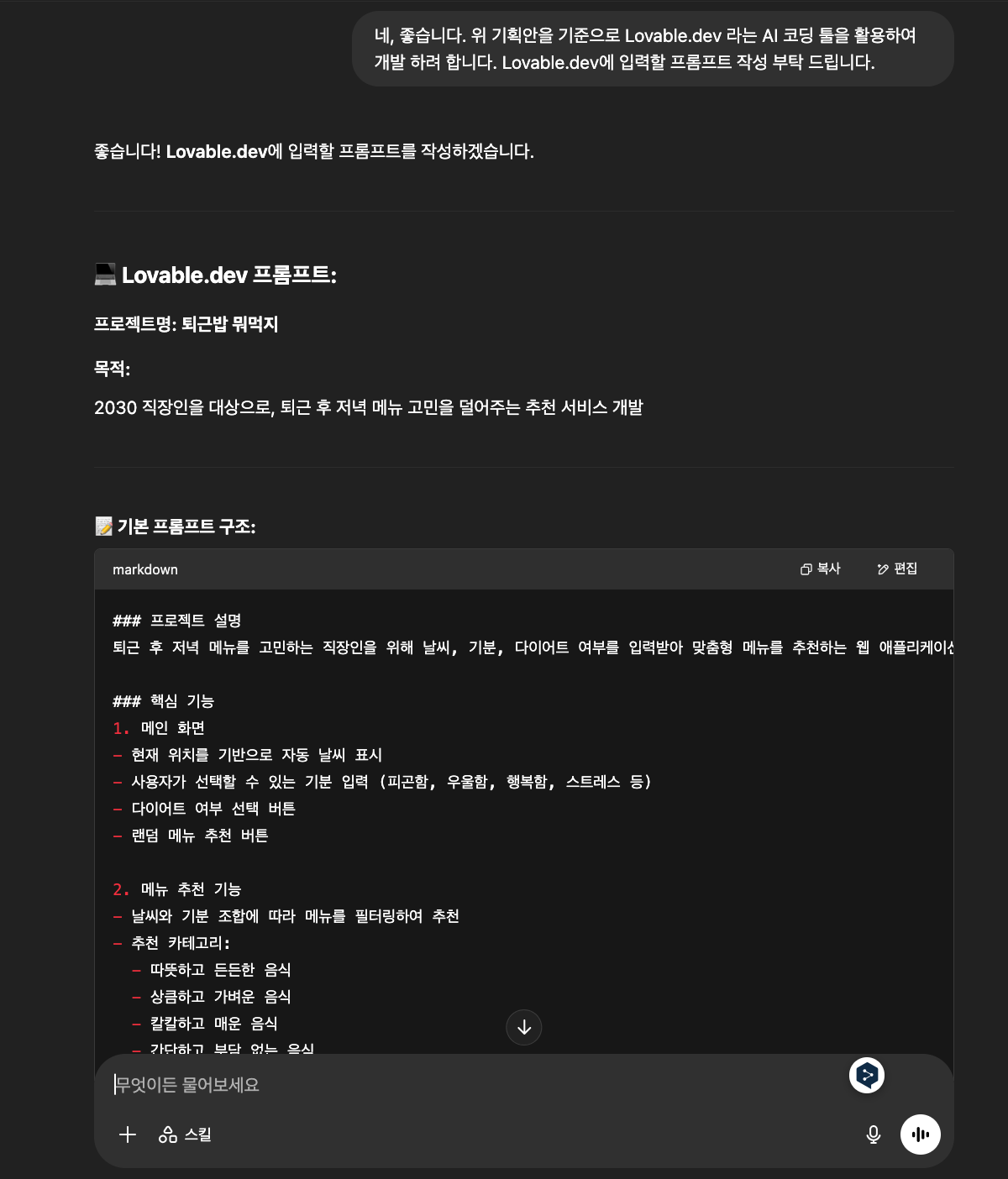 - ChatGPT로 Lovable용 프롬프트 제작 > Lovable에 입력 > MVP ver.01 확인 (5분 소요)